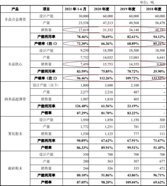 2018年至2021年1-6月,云路股份非晶合金薄帶銷售量分別為48181噸、34148噸、31332噸、17019噸,產銷率分別為85.31%、68.89%、66.36%、72.30%;非晶鐵心銷售量分別為8868噸、14355噸、15753噸、7459噸,產銷率分別為133.53%、109.72%、112.26%、96.46%。
