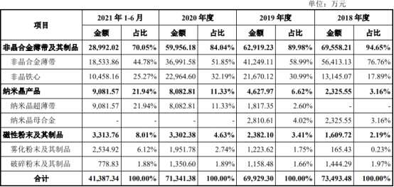 2018年至2021年1-6月,云路股份非晶合金薄帶及其制品收入金額分別為6.96億元、6.29億元、6.00億元、2.90億元,占主營業(yè)務收入比例分別為94.65%、89.98%、84.04%、70.05%;納米晶產品收入金額分別為2325.55萬元、4627.97萬元、8082.81萬元、9081.57萬元,占主營業(yè)務收入比例分別為3.16%、6.62%、11.33%、21.94%;磁性粉末及其制品收入金額分別為1609.72萬元、2382.10萬元、3302.38萬元、3313.76萬元,占主營業(yè)務收入比例分別為2.19%、3.41%、4.63%、8.01%。