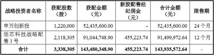 根據(jù)相關(guān)規(guī)定,申銀萬國創(chuàng)新證券投資有限公司按照股票發(fā)行價格認(rèn)購炬芯科技本次公開發(fā)行股票數(shù)量4%的股票,最終參與戰(zhàn)略配售的數(shù)量為122.00萬股,獲配金額5243.56萬元,限售期24個月。