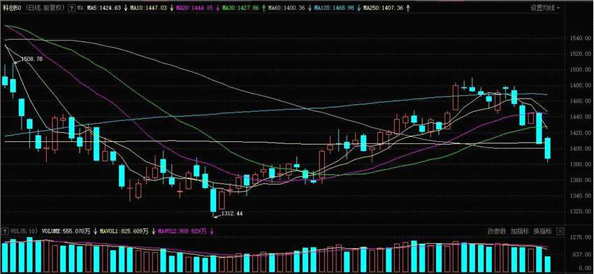 科創(chuàng)50指數(shù)自11月24日創(chuàng)出近期高點1489.71點之后展開震蕩下跌,今日盤中已經(jīng)跌至近1個月新低,較前期高點跌幅超過7%。