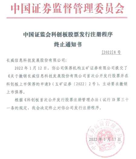 摘要: 近日,中國證監(jiān)會(huì)披露科創(chuàng)板股票發(fā)行注冊程序終止通知書[2022]8號(hào)。長威信息科技發(fā)展股份有限公司(以下簡稱“長威科技”)的保薦機(jī)構(gòu)五礦證券有限公司提交了《關(guān)于撤銷長威信息科技發(fā)展股份有限公司首次公開