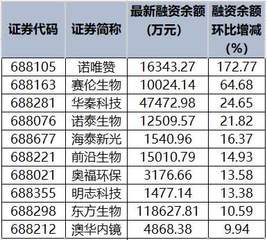 諾唯贊等9只科創(chuàng)板股融資余額增幅超10%