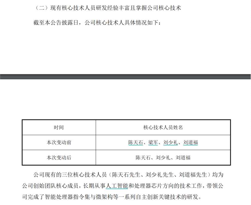 公告披露,梁軍離職后,寒武紀(jì)的核心技術(shù)人員目前剩余三位,分別為陳天石、劉少禮、劉道福,均為寒武紀(jì)創(chuàng)始團(tuán)隊(duì)核心成員。