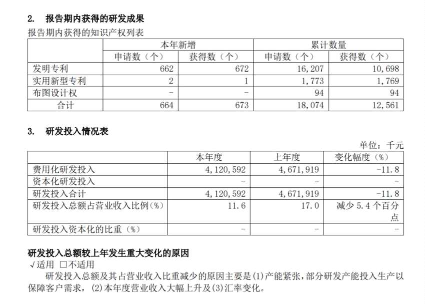 報(bào)告期內(nèi),中芯國(guó)際研發(fā)投入為41.21億元,占營(yíng)業(yè)收入的比例為11.6%,同比下降5.4個(gè)百分點(diǎn)。
