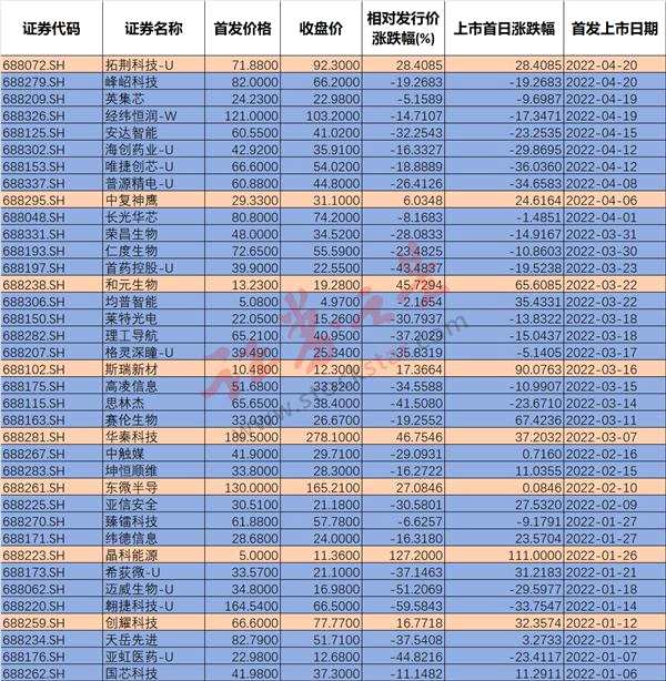 根據(jù)數(shù)據(jù)統(tǒng)計,截至2022年4月20日,今年科創(chuàng)板一共37家新股上市,20家新股首日破發(fā),首日破發(fā)率54%。值得一提的是,科創(chuàng)板發(fā)行以來,一共上市414家企業(yè),31家上市首日破發(fā),2021年10月份前僅有1家,2021年10月份后30家。
