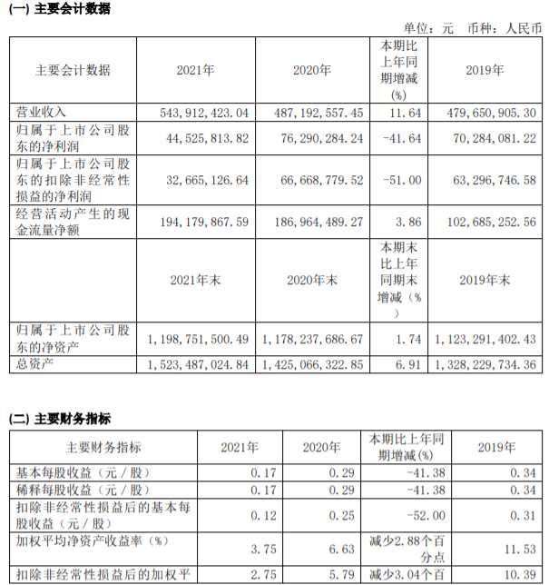 2021年,公司經(jīng)營(yíng)活動(dòng)產(chǎn)生的現(xiàn)金流量?jī)纛~為1.94億元,同比增長(zhǎng)3.86%;基本每股收益0.17元,同比減少41.38%;加權(quán)平均凈資產(chǎn)收益率為3.75%,同比減少2.88個(gè)百分點(diǎn)。