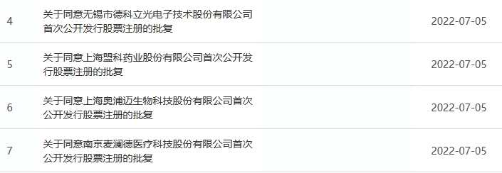 據(jù)證監(jiān)會7月5日消息,證監(jiān)會批復(fù)同意無錫市德科立光電子技術(shù)股份有限公司、上海盟科藥業(yè)股份有限公司、上海奧浦邁生物科技股份有限公司、南京麥瀾德醫(yī)療科技股份有限公司科創(chuàng)板首次公開發(fā)行股票注冊。