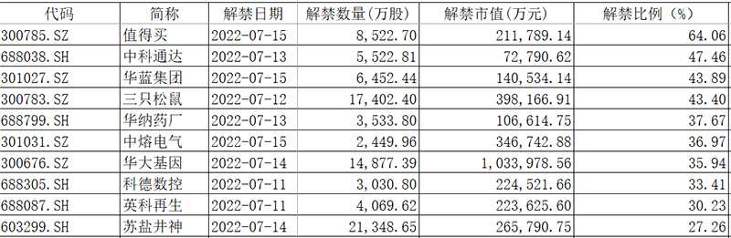 按解禁市值占總市值的比例計算,值得買(300785)(64.06%)、中科通達(dá)(47.46%)、華藍(lán)集團(tuán)(301027)(43.89%)、【三只松鼠(300783)、股吧】(43.40%)、華納藥廠(37.67%)解禁比例居前。