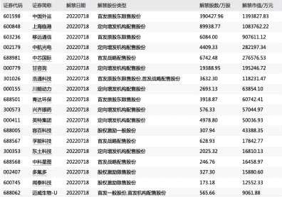 據(jù)數(shù)據(jù)統(tǒng)計(jì),本周7月18日至7月22日期間,共有94只股解禁,按照最新收盤價(jià)計(jì)算,合計(jì)解禁市值超2400億元。其中,中微公司、瀾起科技解禁市值居前,均超300億元,中國通號、【杭可科技(688006)、股吧】均超200億元,中國外運(yùn)、西部超導(dǎo)、上海臨港(600848)、華興源創(chuàng)、【南微醫(yī)學(xué)(688029)、股吧】等均在百億以上;此外,華興源創(chuàng)、中國通號和南微醫(yī)學(xué)7月解禁市值占自由流通市值比較高,分別為716%、327%和282%。