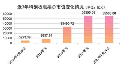 歷經(jīng)三年發(fā)展,科創(chuàng)板市值規(guī)模已十分可觀。2019年7月22日,首批上市的25家公司總市值僅為5293.39億元;2019年末,70家科創(chuàng)板上市公司總市值為8637.64億元;2020年末,215家科創(chuàng)板上市公司總市值升至33490.72億元;2021年末,377家科創(chuàng)板上市公司總市值達(dá)56305.56億元。