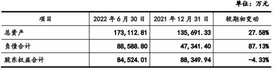 截至2022年6月30日,公司總資產(chǎn)為173,112.81萬元,同比增長27.58%;負債合計88,588.80萬元,同比增長87.13%;股東權(quán)益合計84,524.01萬元,同比下降4.33%。