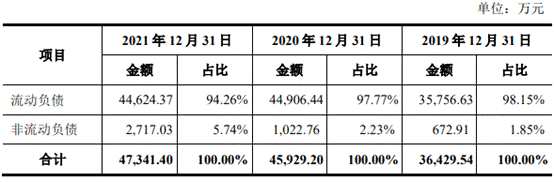 2019年末-2021年末,微導(dǎo)納米負債合計分別為36,429.54萬元、45,929.20萬元、47,341.40萬元,其中流動負債分別為35,756.63萬元、44,906.44萬元、44,624.37萬元。