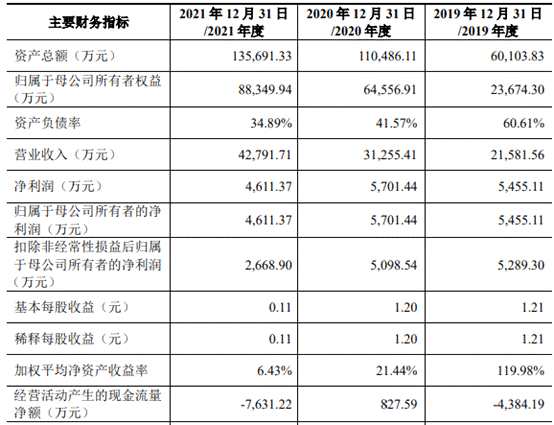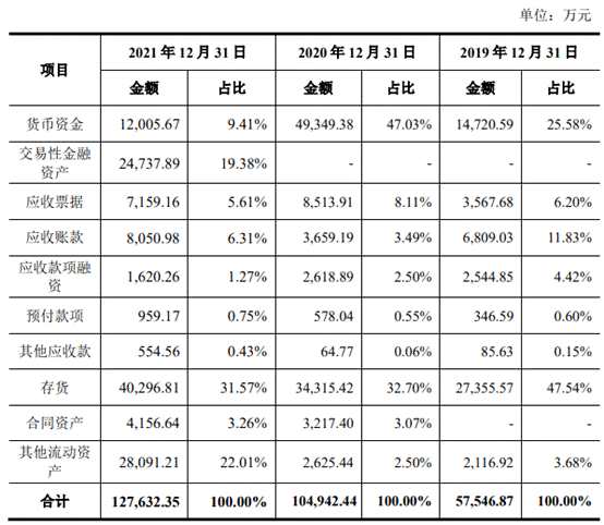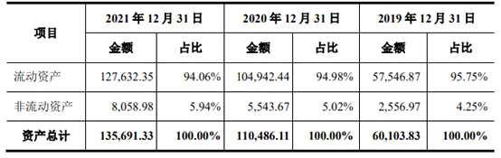 2019年末-2021年末,微導(dǎo)納米資產(chǎn)總計分別為60,103.83萬元、110,486.11萬元、135,691.33萬元,其中流動資產(chǎn)分別為57,546.87萬元、104,942.44萬元、127,632.35萬元,占比分別為95.75%、94.98%、94.06%。