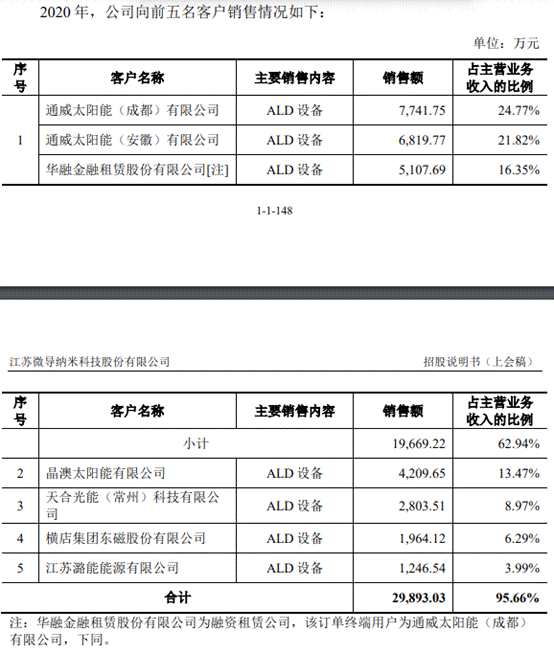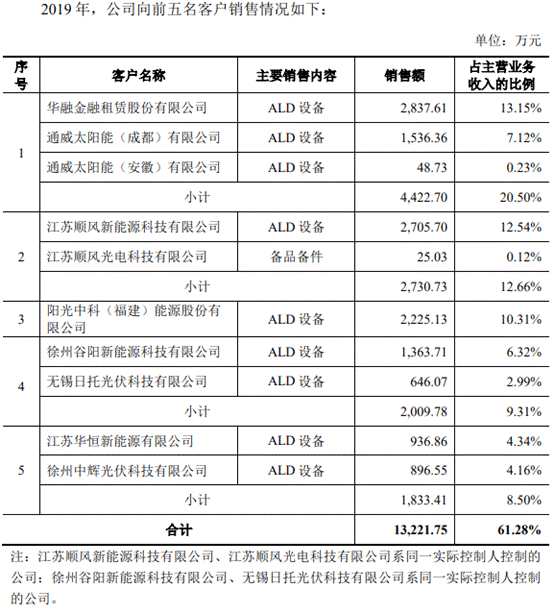 2019年-2021年,微導(dǎo)納米對前五名客戶的銷售金額合計分別為13,221.75萬元、29,893.03萬元、35,987.72萬元,占公司主營業(yè)務(wù)收入的比例分別為61.28%、95.66%、84.18%。