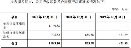 報告期各期末,公司應(yīng)收賬款及合同資產(chǎn)壞賬準(zhǔn)備合計分別為421.89萬元、855.58萬元、1,849.10萬元。