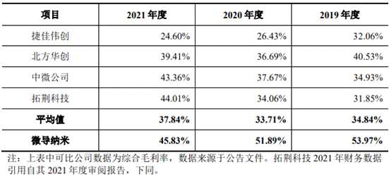 2019年-2021年,微導(dǎo)納米主營業(yè)務(wù)毛利率分別為53.97%、51.89%、45.83%。同行業(yè)可比公司毛利率平均值分別為34.84%、33.71%、37.84%。公司毛利率去年下降,但仍連續(xù)三年均為同行最高。
