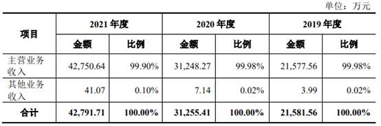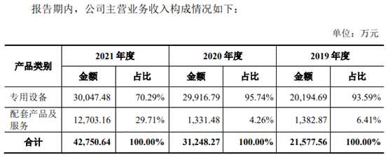 2019年-2021年,微導(dǎo)納米主營業(yè)務(wù)收入分別為21,577.56萬元、31,248.27萬元、42,750.64萬元。主營業(yè)務(wù)收入構(gòu)成中,各期專用設(shè)備收入分別為20,194.69萬元、29,916.79萬元、30,047.48萬元,占比分別為93.59%、95.74%、70.29%。