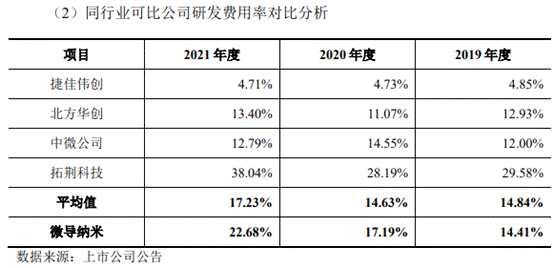 2019年-2021年,微導(dǎo)納米研發(fā)費用分別為3,109.05萬元、5,373.47萬元、9,704.00萬元,研發(fā)費用率分別為14.41%、17.19%、22.68%。同行業(yè)可比公司研發(fā)費用率平均值分別為14.84%、14.63%、17.23%。