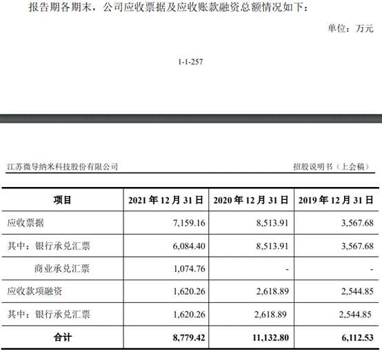 2019年末-2021年末,微導(dǎo)納米應(yīng)收賬款及合同資產(chǎn)賬面余額分別為7,230.92萬元、7,732.16萬元、14,056.72萬元,占當(dāng)期營業(yè)收入比例分別為33.51%、24.74%、32.85%;應(yīng)收票據(jù)及應(yīng)收賬款融資總額分別為6,112.53萬元、11,132.80萬元、8,779.42萬元。