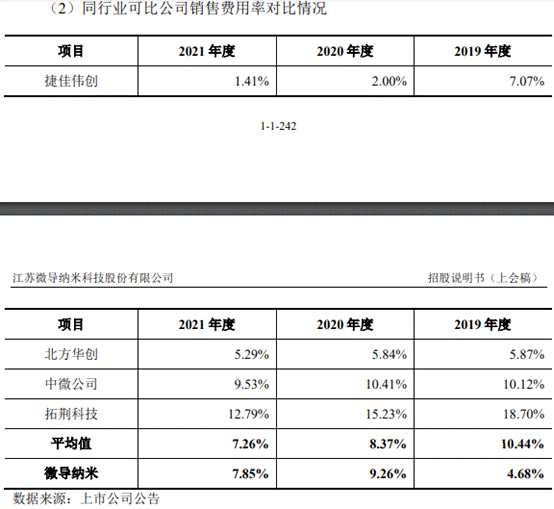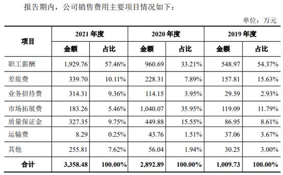 2019年-2021年,微導(dǎo)納米銷售費用分別為1,009.73萬元、2,892.89萬元、3,358.48萬元,銷售費用率分別為4.68%、9.26%、7.85%。同行業(yè)可比公司銷售費用率平均值分別為10.44%、8.37%、7.26%。