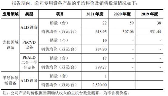 報告期內(nèi),公司專用設(shè)備產(chǎn)品主要包括ALD設(shè)備、PECVD設(shè)備、PEALD二合一平臺設(shè)備。各期,公司光伏領(lǐng)域ALD設(shè)備銷售收入分別為20,194.69萬元、29,916.79萬元、13,616.86萬元,占各期公司主營業(yè)務(wù)收入的比例分別為93.59%、95.74%、31.85%,該產(chǎn)品去年收入同比減少54.48%。2019年-2021年,微導(dǎo)納米光伏領(lǐng)域ALD設(shè)備銷量分別為38臺、59臺、22臺,2021年銷量大降62.71%;銷售均價分別為531.44萬元/臺、507.06萬元/臺、618.95萬元/臺。