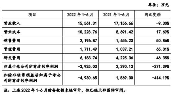今年上半年微導(dǎo)納米凈利轉(zhuǎn)為虧損。2022年1-6月,微導(dǎo)納米營業(yè)收入為15,561.31萬元,同比下降9.30%;歸屬于母公司所有者的凈利潤為-3,925.03萬元,同比下降271.39%,上年同期為2,290.13萬元;扣除非經(jīng)常損益后歸屬于母公司所有者的凈利潤為-4,930.65萬元,同比下降414.19%,上年同期為1,569.30萬元。