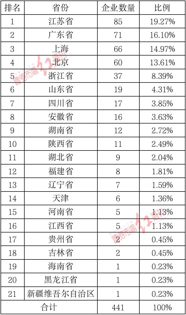 根據(jù)數(shù)據(jù)統(tǒng)計(jì),441家科創(chuàng)板上市公司分布在17個(gè)省份、3個(gè)直轄市以及1個(gè)自治區(qū)。其中江蘇省、廣東省和上海市的科創(chuàng)板企業(yè)數(shù)量最多,分別有85家、71家和66家,占科創(chuàng)板上市企業(yè)總數(shù)量的比例分別為19.27%、16.10%和14.97%。