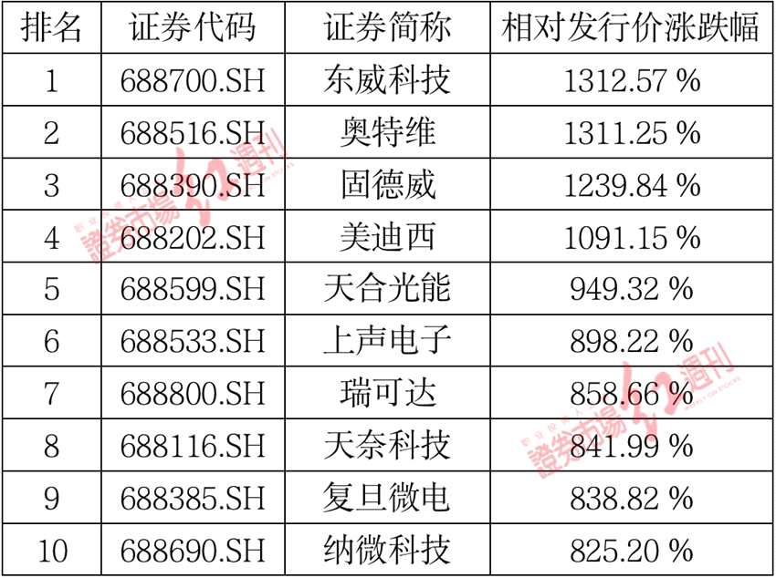 科創(chuàng)板開(kāi)市三年來(lái),大多數(shù)公司的市場(chǎng)表現(xiàn)均不錯(cuò)。根據(jù)數(shù)據(jù)統(tǒng)計(jì),截至7月28日收盤,在科創(chuàng)板上市的441家公司中,有334家公司的股價(jià)較發(fā)行價(jià)格實(shí)現(xiàn)了上漲。其中,東威科技漲幅最高,達(dá)到了1312.57 %,而禾邁股份的股價(jià)為947.98元,股價(jià)位列科創(chuàng)板企業(yè)第一。此外,漲幅靠前的公司還有奧特維、固德威和【美迪西(688202)、股吧】等公司,股價(jià)漲幅均超發(fā)行價(jià)10倍。