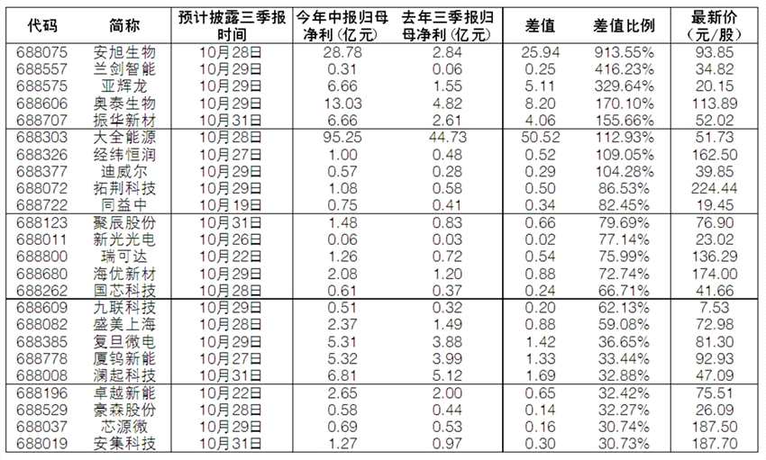 由于科創(chuàng)板三季報預(yù)告情況采取自愿性披露,因此部分業(yè)績向好公司并未顯示。記者依據(jù)今年中報歸母凈利為正、去年三季報歸母凈利為正,且中報歸母凈利大于去年三季報為標準,剔除已經(jīng)預(yù)告的公司,篩選出安旭生物、蘭劍智能、亞輝龍、奧泰生物、振華新材、大全能源、經(jīng)緯恒潤、【迪威爾(688377)、股吧】這8家公司三季報預(yù)增概率較大。記者 劉揚