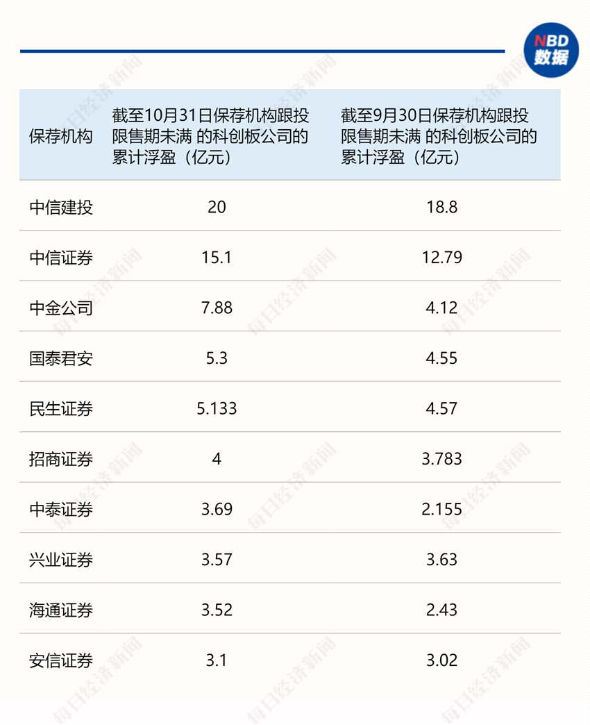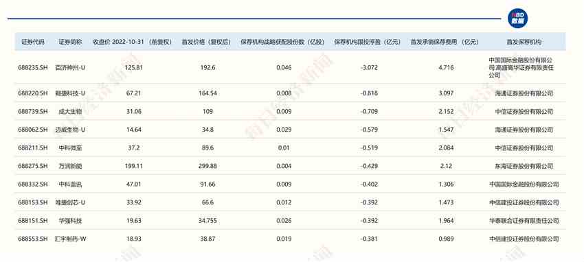 截至10月31日保薦機(jī)構(gòu)跟投浮虧規(guī)模排名前的10科創(chuàng)板公司