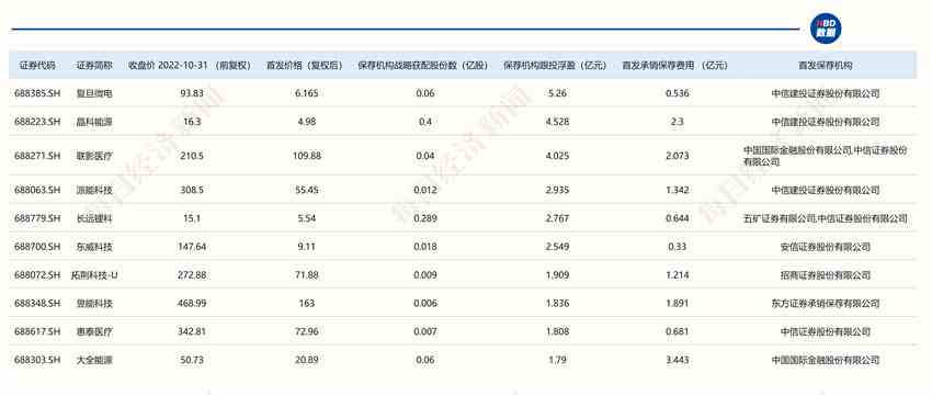 截至10月31日保薦機(jī)構(gòu)跟投浮盈規(guī)模排名前10的科創(chuàng)板公司