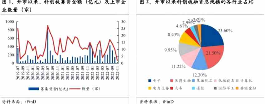 科創(chuàng)板開市以來融資7351.61億元,主要支持國家戰(zhàn)略導向企業(yè)。科創(chuàng)板誕生于科技自立自強的國家戰(zhàn)略背景之下,自2019年開市以來,為科創(chuàng)企業(yè)融資達7351.61億元,上市公司數(shù)量超480余家,為科創(chuàng)企業(yè)解決資金缺口、突破技術瓶頸做出重要貢獻。科創(chuàng)板募集資金主要集中于高新技術產(chǎn)業(yè)以及戰(zhàn)略性新興產(chǎn)業(yè),截至2022年11月13日,科創(chuàng)板募資總金額中,電子、醫(yī)藥生物、基礎化工、機械設備、計算機行業(yè)分別募資1743.7億元、1588.94億元、901.24億元、829.08億元以及735.47億元,各占總募資金額的23.60%、21.50%、12.20%、11.22%以及9.95%,體現(xiàn)科創(chuàng)板助力解決“卡脖子”技術難題的時代使命。