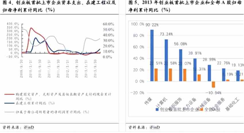 從結構上看,創(chuàng)業(yè)板首批上市企業(yè)所處的大部分行業(yè)在2013年業(yè)績兌現(xiàn)期里的表現(xiàn)都顯著優(yōu)于全部A股的表現(xiàn)。傳媒、計算機行業(yè)的歸母凈利累計同比高出全部A股50%,紡織服飾、電力設備以及機械設備等行業(yè)2013年累計歸母凈利同比高于A股市場超30%,整體上看,2013年首批創(chuàng)業(yè)板上市企業(yè)業(yè)績領先市場。