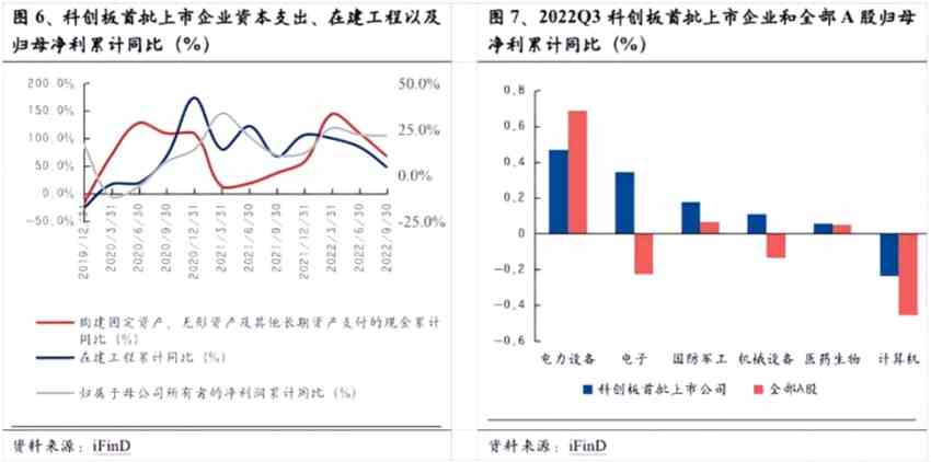 與全部A股相比,科創(chuàng)板首批上市企業(yè)2022Q3的業(yè)績表現(xiàn)中,除了電力設備行業(yè)歸母凈利累計同比低于全部A股外,其他行業(yè)業(yè)績增速均超過A股市場。整體上看,首批科創(chuàng)板上市企業(yè)歸母凈利累計平均超過全體A股15.35%,分結構來看,電子行業(yè)科創(chuàng)首批上市企業(yè)高于全體A股57.10%。機械設備行業(yè)全體A股2022Q3歸母凈利同比下降,而科創(chuàng)首批上市企業(yè)仍然保持了正值增長率,為11.07%。參照創(chuàng)業(yè)板業(yè)績兌現(xiàn)軌跡,隨著科創(chuàng)板投產(chǎn)進度不斷推進,業(yè)績有望迎來新一輪增長。