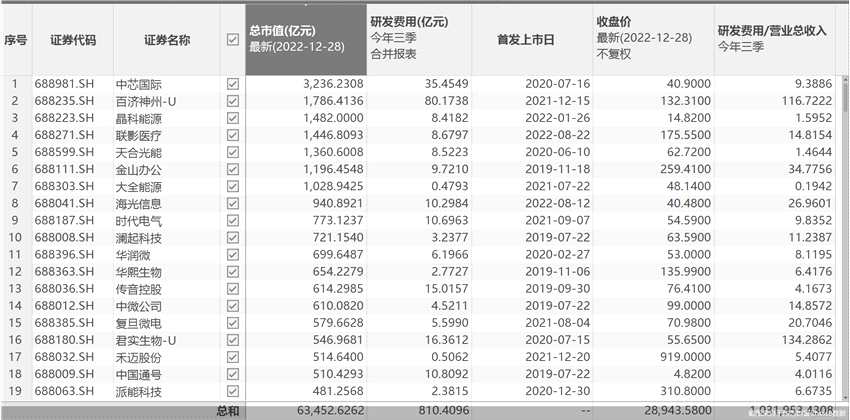 從研發(fā)投入的角度來(lái)看,數(shù)據(jù)顯示,今年前三季度,科創(chuàng)板個(gè)股總研發(fā)費(fèi)用為810.41億元。其中百濟(jì)神州研發(fā)費(fèi)用最高,為80.17億元,中芯國(guó)際次之,為35.45億元。君實(shí)生物、傳音控股、奇安信、天能股份、中國(guó)通號(hào)、時(shí)代電氣、海光信息7股研發(fā)費(fèi)用也在10億元以上。