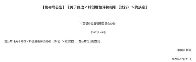 據(jù)證監(jiān)會網(wǎng)站消息,證監(jiān)會12月30日公布了《關(guān)于修改<科創(chuàng)屬性評價指引(試行)>的決定》,自公布之日起施行。
