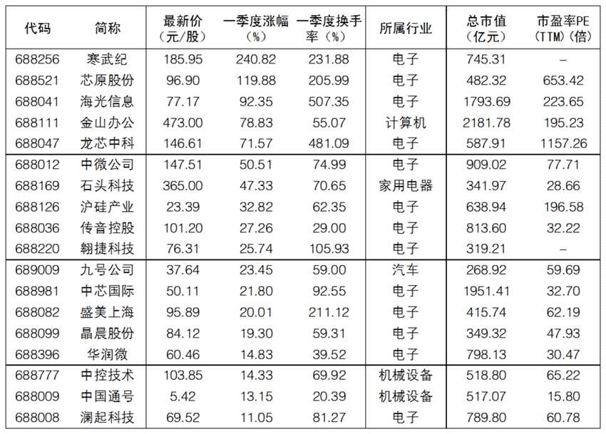 18只科創(chuàng)50成份股一季度漲幅超過10%