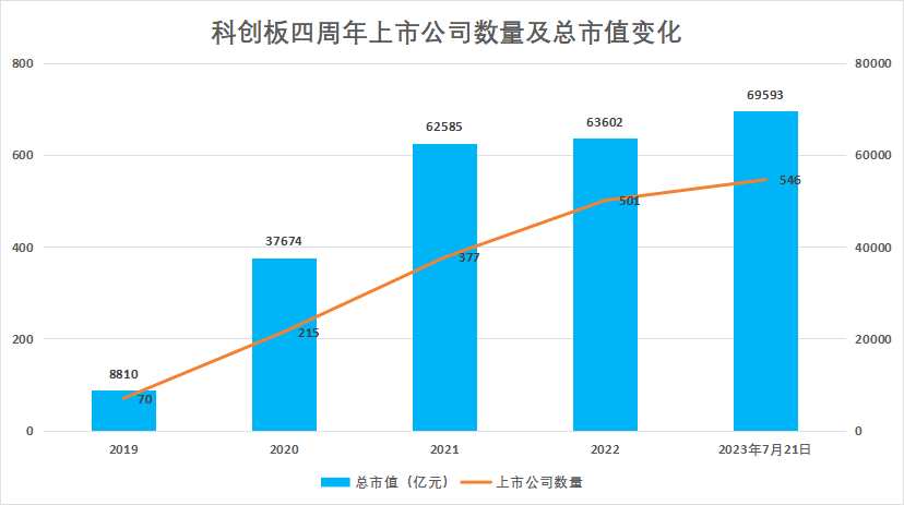 2019年7月22日,科創(chuàng)板首批25家企業(yè)上市。截至2023年7月21日,科創(chuàng)板已走過四個年頭。數(shù)據(jù)統(tǒng)計(jì),四年以來科創(chuàng)板上市公司數(shù)量達(dá)到546家(不包括年內(nèi)2只退市股),總市值69593億元。