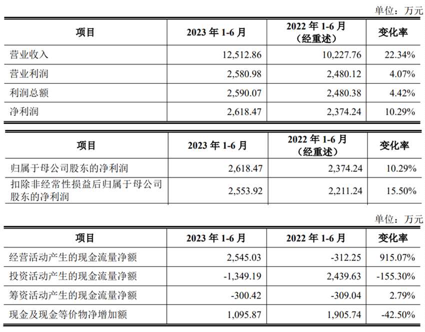 2023年1-6月,浩辰軟件的營業(yè)收入為12,512.86萬元,同比增加22.34%;凈利潤/歸屬于母公司股東的凈利潤為2,618.47萬元,同比增加10.29%;扣除非經(jīng)常性損益后歸屬于母公司股東的凈利潤為2,553.92萬元,同比增加了15.50%;經(jīng)營活動產(chǎn)生的現(xiàn)金流量凈額為2,545.03萬元,同比增加915.07%。
