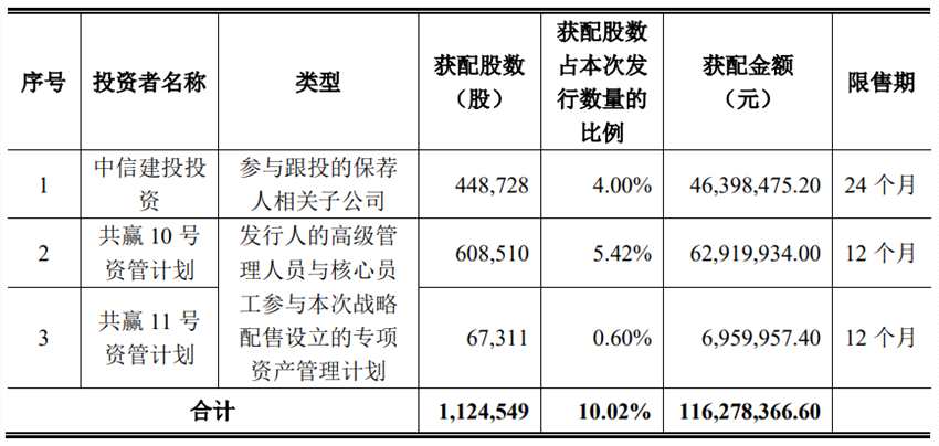 浩辰軟件本次發(fā)行的戰(zhàn)略配售由保薦人相關(guān)子公司跟投、發(fā)行人高級管理人員與核心員工參與本次戰(zhàn)略配售設(shè)立的專項資產(chǎn)管理計劃組成?其中,跟投機(jī)構(gòu)為中信建投投資有限公司(簡稱“中信建投投資”),中信建投投資跟投比例為本次公開發(fā)行股票數(shù)量的4.00%,實際跟投股數(shù)為448,728股,獲配金額為46,398,475.20元。