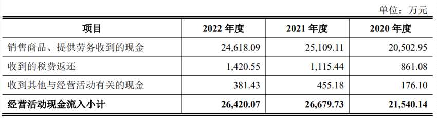 上述同期,公司銷售商品、提供勞務(wù)收到的現(xiàn)金分別為20,502.95萬元、25,109.11萬元和24,618.09萬元,經(jīng)營活動產(chǎn)生的現(xiàn)金流量凈額分別為6,971.06萬元、5,269.07萬元和4,158.29萬元。
