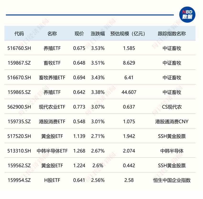 ETF漲跌幅方面,畜牧養(yǎng)殖相關(guān)ETF大漲超3%。