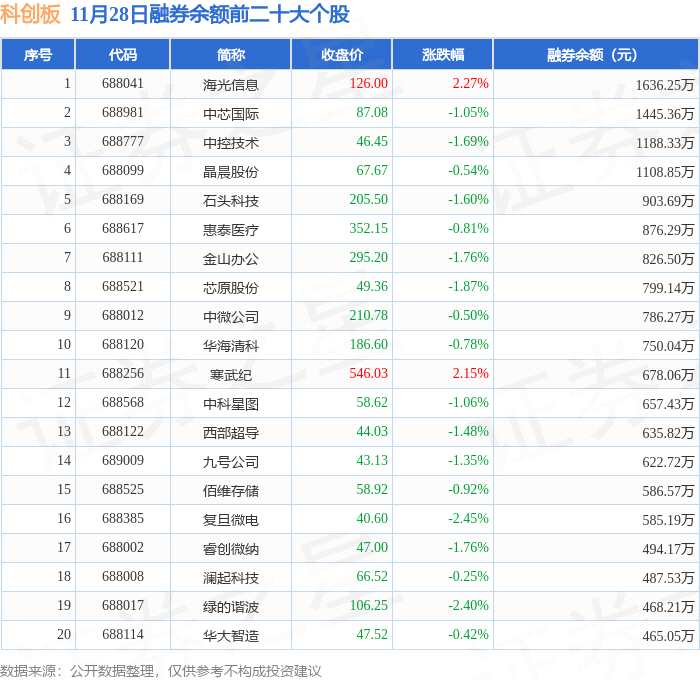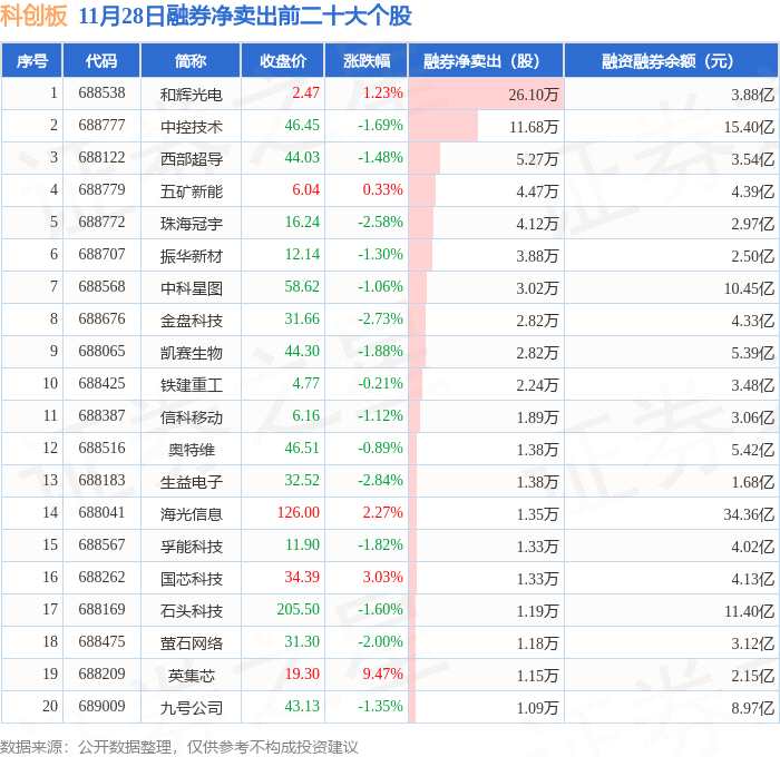 11月28日科創(chuàng)板融券凈賣出排行榜:和輝光電融券凈賣出居首