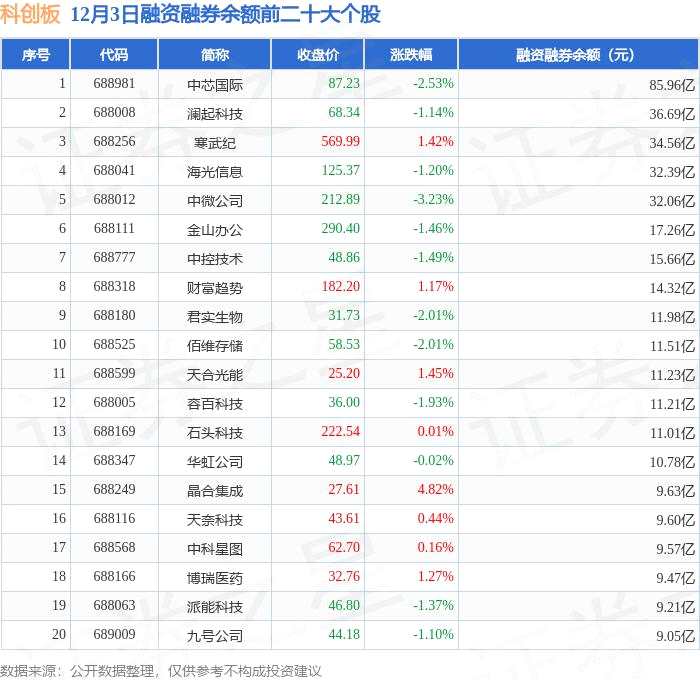 科創(chuàng)板融資融券余額前三分別為:中芯國際(688981)融資融券余額85.96億元、瀾起科技(688008)融資融券余額36.69億元、寒武紀(688256)融資融券余額34.56億元,前20具體見下表: