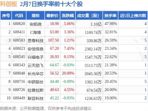 2月7日科創(chuàng)板換手率前十大個(gè)股,安凱微居首