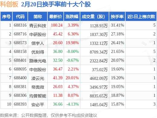 2月20日科創(chuàng)板換手率前十大個(gè)股,青云科技居首