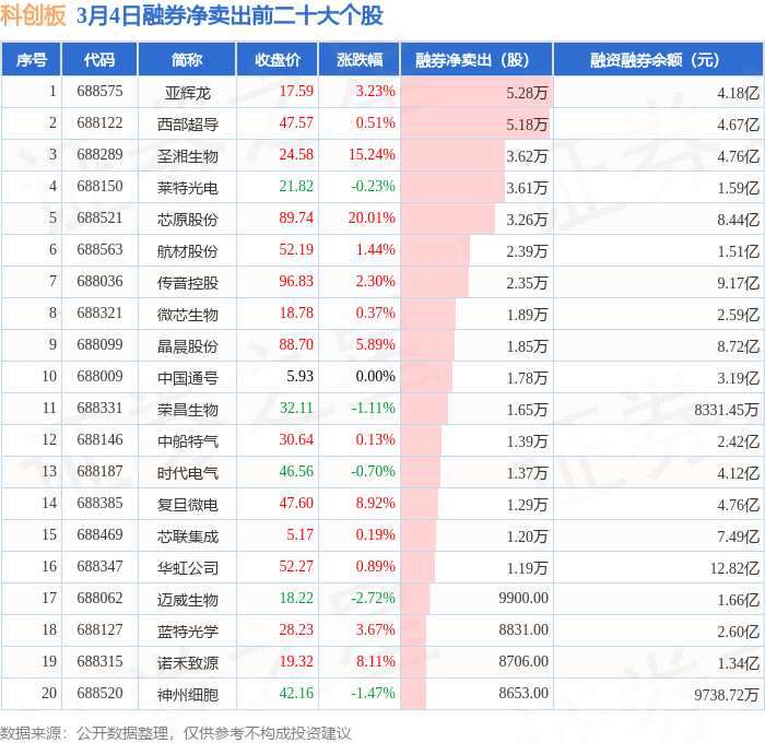 3月4日科創(chuàng)板融券凈賣出排行榜:亞輝龍融券凈賣出居首