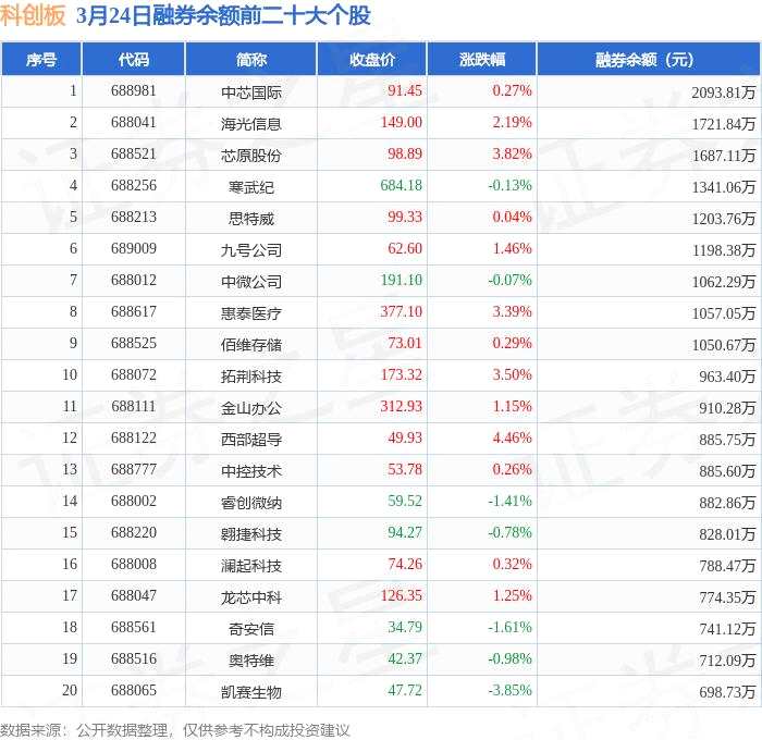 3月24日科創(chuàng)板融券凈賣出排行榜:頎中科技融券凈賣出居首