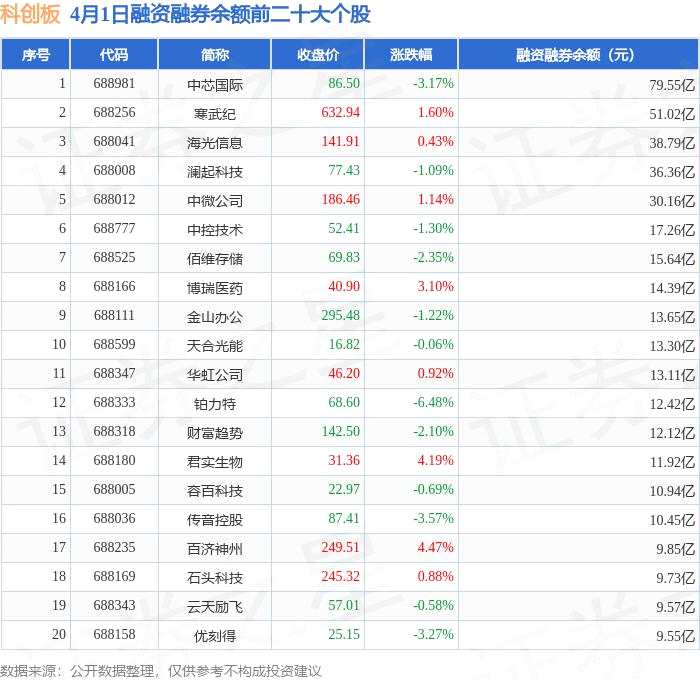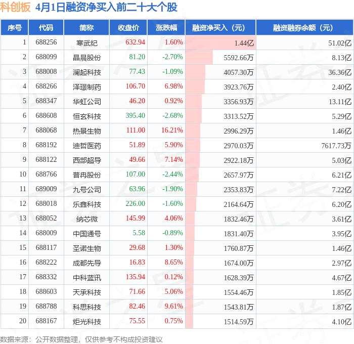 4月1日科創(chuàng)板融資凈買入排行榜:寒武紀(jì)融資凈買入居首