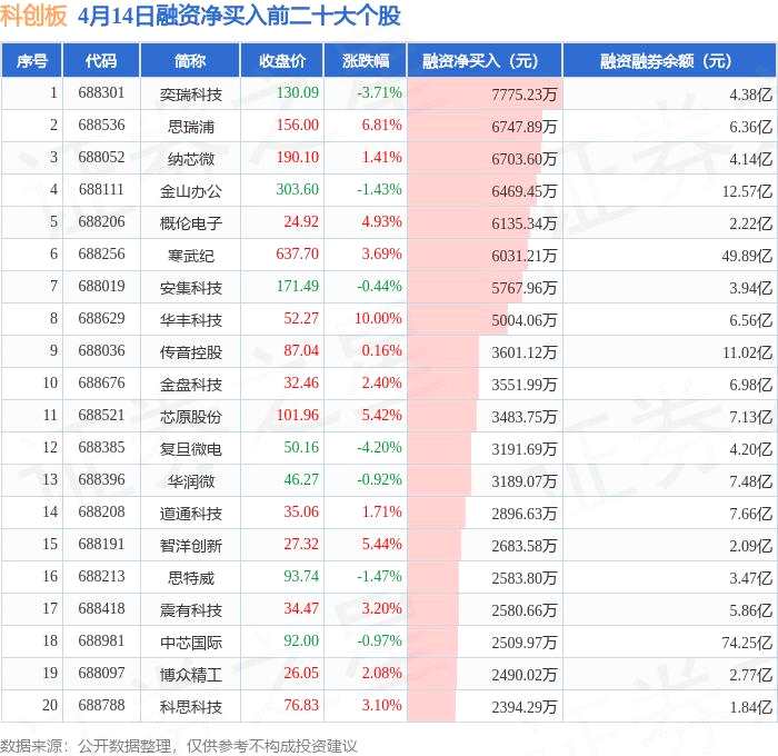 4月14日科創(chuàng)板融資凈買入排行榜:奕瑞科技融資凈買入居首
